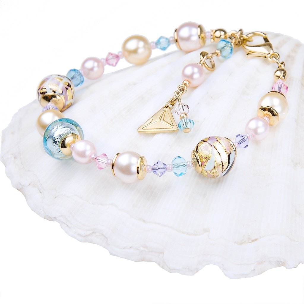 Bransoletka w kombinacji pastelowych kolorów wykonana jest z pereł lampowych, w które wkomponowano czyste złoto. Łańcuszek bransoletki wykonany jest z solidnego drutu ozdobionego szklanymi elementami i perełkami lampowymi w kolorze niebieskim, białym i różowym. Polecamy łączyć z inną biżuterią z serii Romantic Roots lub z biżuterią z kolekcji Mystic Art.