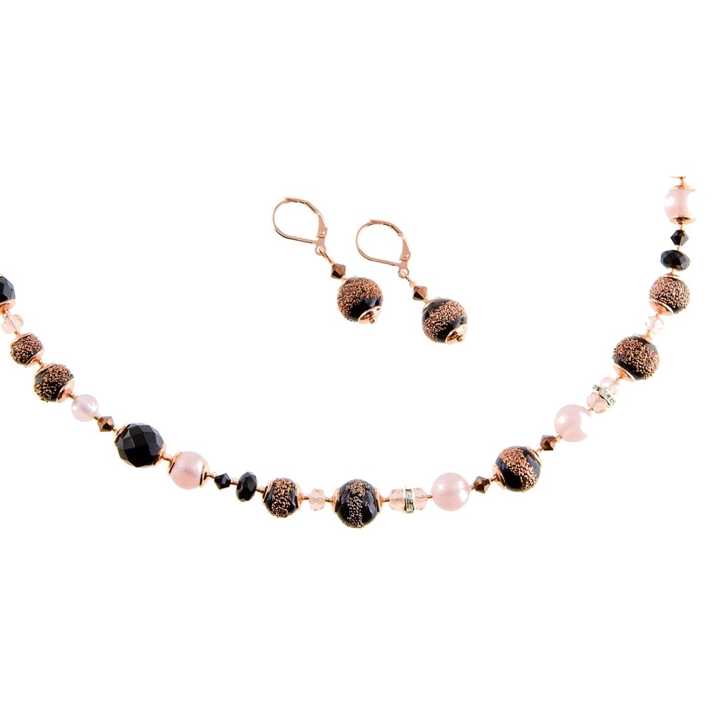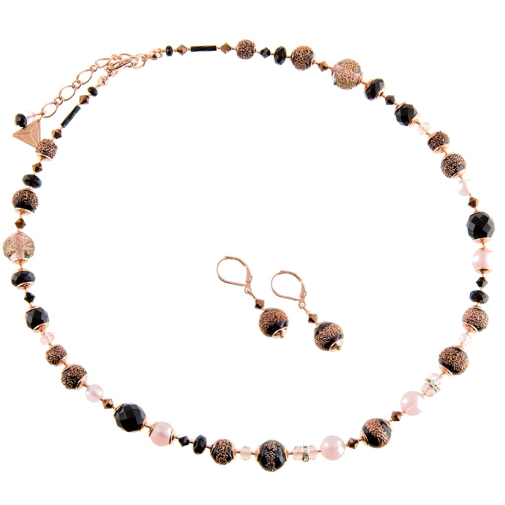 Pierwszy przymrozek, który zapanował nad winnicą, owinąwszy swoimi lodowatymi ramionami owoce dojrzałych, ciemnoniebieskich winogron, namalował na ich powierzchni pierwsze kryształki, ukazując swą mroźną moc. Te detale zainspirowały nas do stworzenia ciemnych, czarnych pereł lampowych z różowym zdobieniem, charakterystycznym tylko dla naszej pracowni. Tak ozdobione perły umieściliśmy na naszyjniku i połączyliśmy je z perłami w kolorze delikatnego różu, aby razem stworzyły idealnie kontrastujący i wyrazisty naszyjnik. Jeśli jesteś miłośniczką nowości i chcesz wyróżnić się z tłumu, stworzyliśmy tę kompozycję właśnie dla Ciebie.